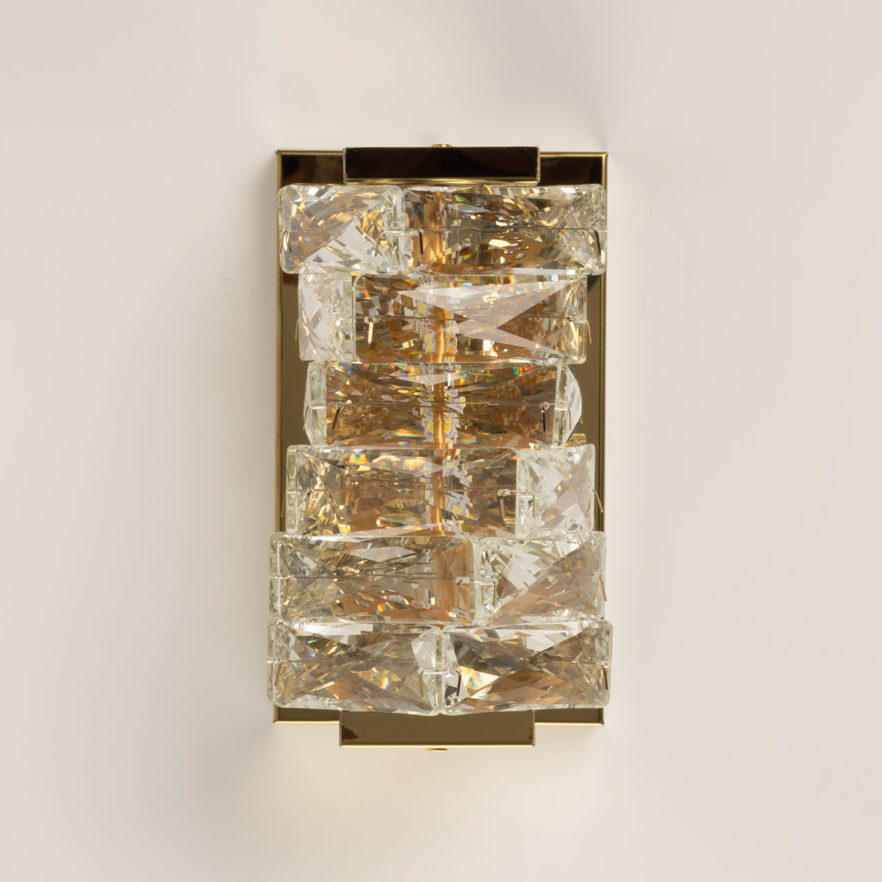 Основание настенного бра выполнено из нержавеющей стали и гальванизировано в цвет золота. Настенный светильник декорирован прозрачным хрусталем прямоугольной формы.