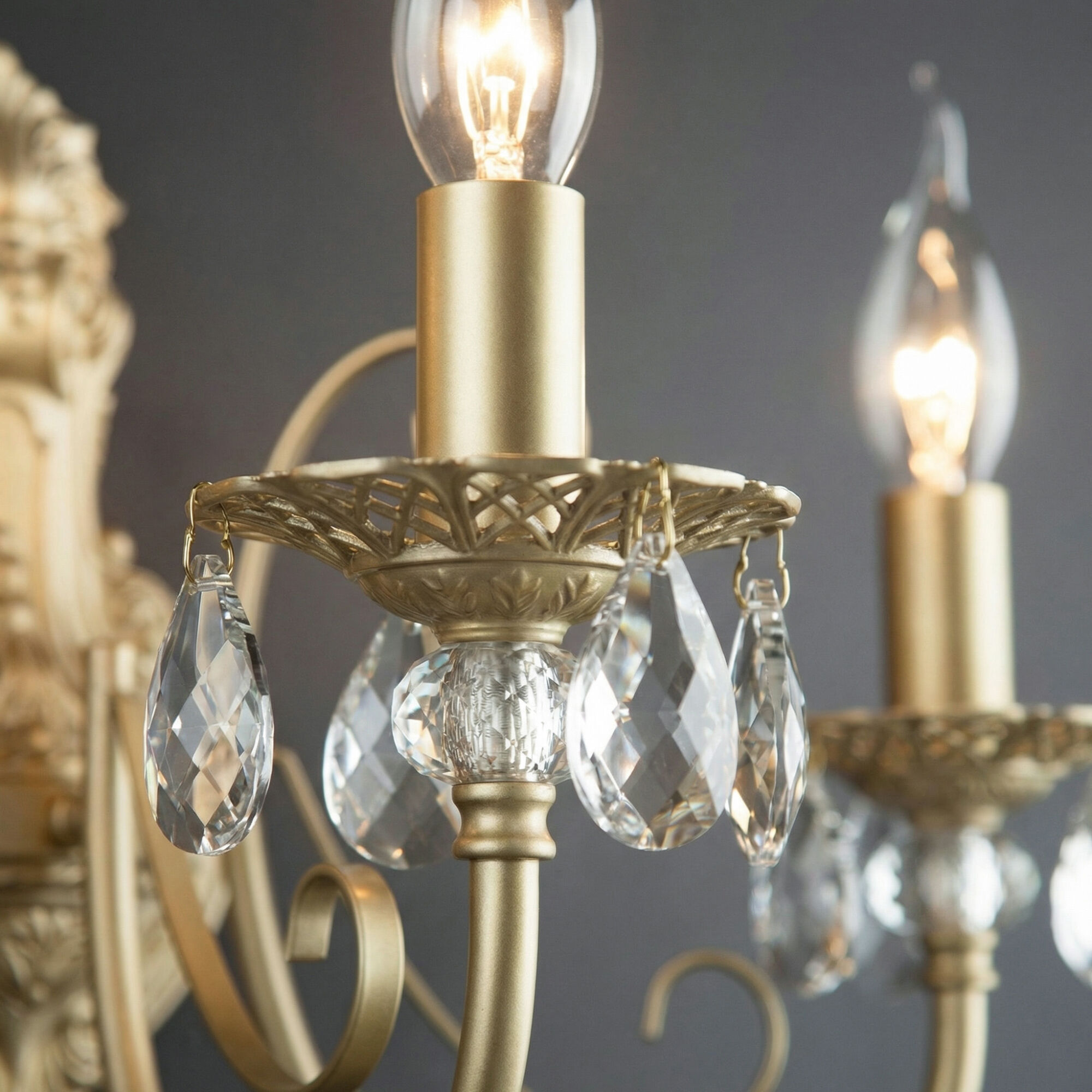 Светильник для тех, кто ценит традиции и безупречное качество. Латунная арматура с детализированными вензелями не тускнеет со временем, сохраняя благородный блеск, а бесцветный хрусталь преломляет свет, создавая эффектную игру бликов.