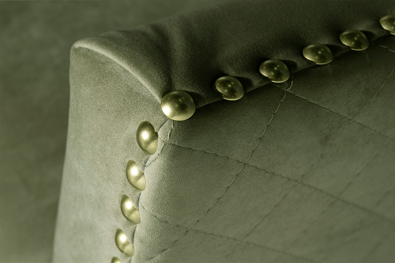 В стандартном исполнении: обивка в ткани из коллекции Garda Decor- велюр Colt1002-OLIV, цвет ножек - 4, колесная опора - нет, гвозди большие, цвет золото.