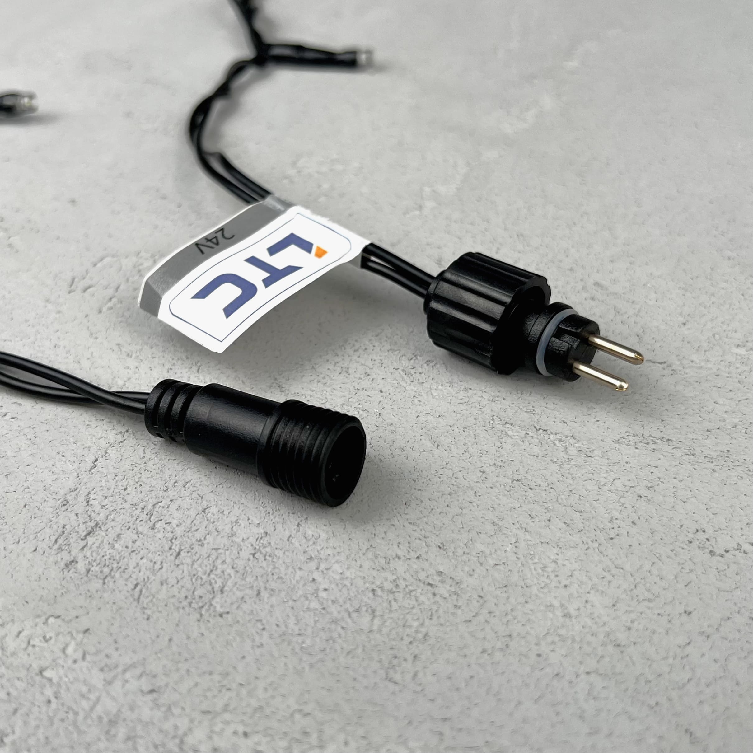 Для подключения данной гирлянды требуется трансформатор. ⚠️ Блок Питания Электронный 60W для Нитей 24В, до 1000 LED, Провод Черный Каучук, IP65 – Необходим для подключения гирлянды к питанию (к розетке 220В). Используя данный трансформатор, вы сможете соединить последовательно в цепь до 1000 светодиодов (например, если в одной гирлянде 100 светодиодов, то вы сможете соединить последовательно до 10 гирлянд).