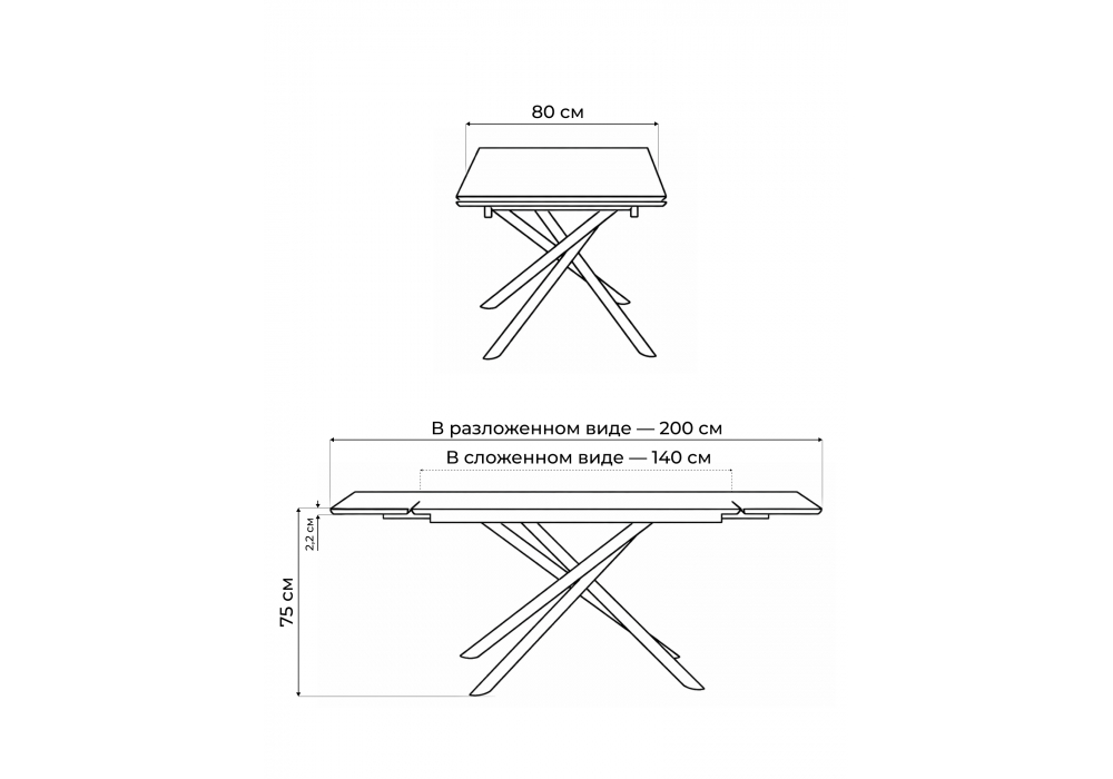 Материал каркаса - металл; Материал столешницы - Керамика; Цвет ножек - черный; Ширина - 80; Высота - 75; Длина стола в разложенном виде - 180; Длина - 120;