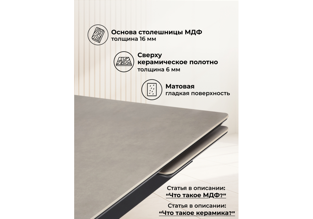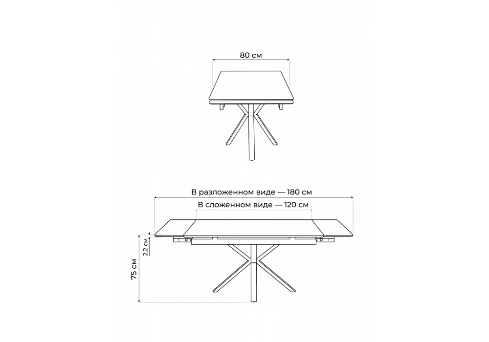 Материал каркаса - металл; Материал столешницы - Керамика; Цвет ножек - черный; Ширина - 80; Высота - 75; Длина стола в разложенном виде - 180; Длина - 120;