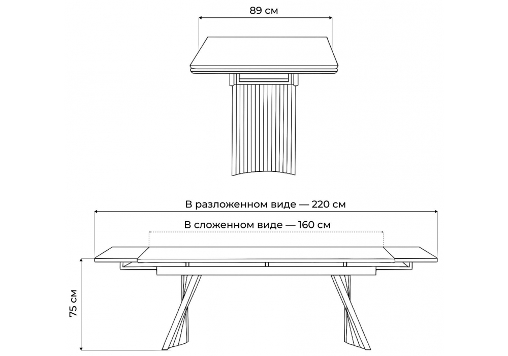 Материал каркаса - металл; Материал столешницы - Керамика; Цвет ножек - черный; Ширина - 89; Высота - 75; Длина стола в разложенном виде - 220; Длина - 160;