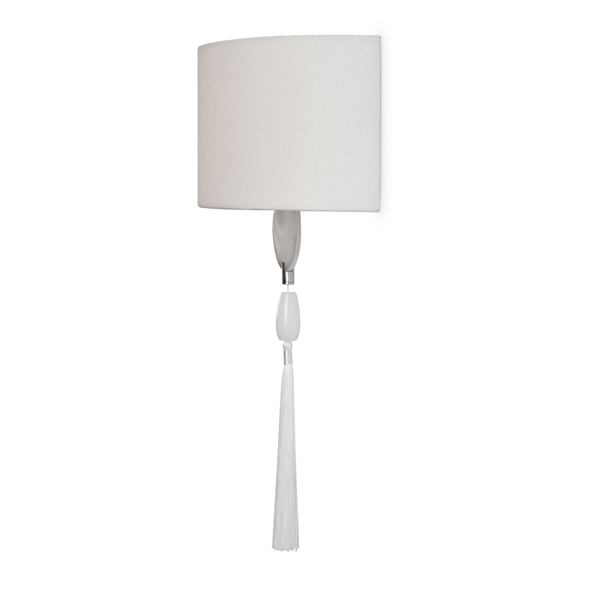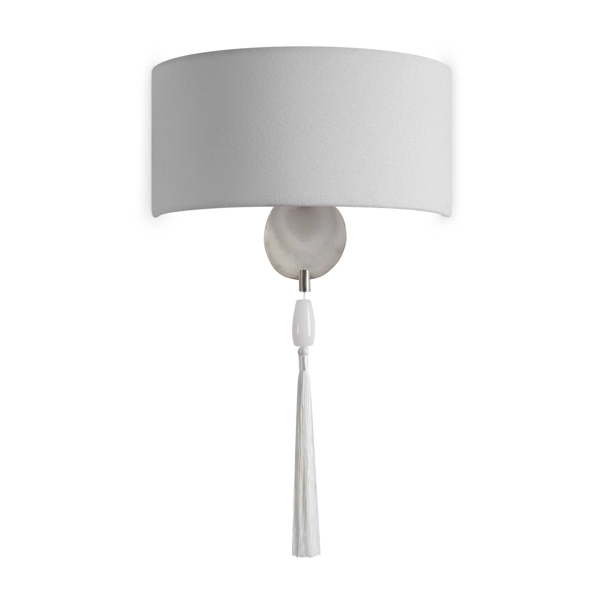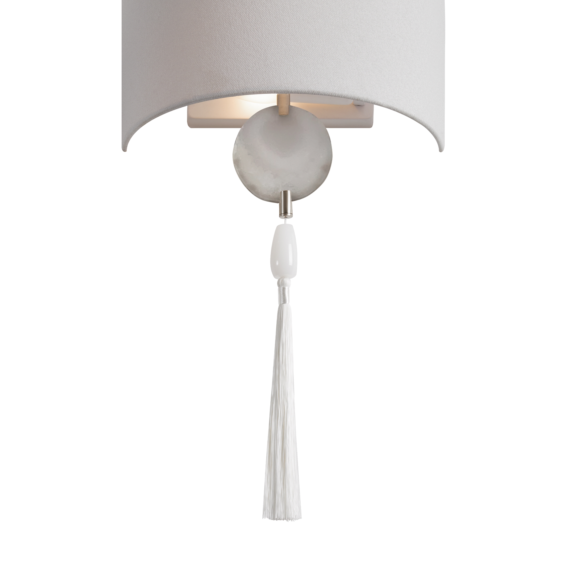 Металлическая арматура в цвете никель. Светильники с натуральным агатом, серым тканевым абажуром и декоративными кисточками . Лампы E14 (не в комплекте). Бра с регулируемой высотой.