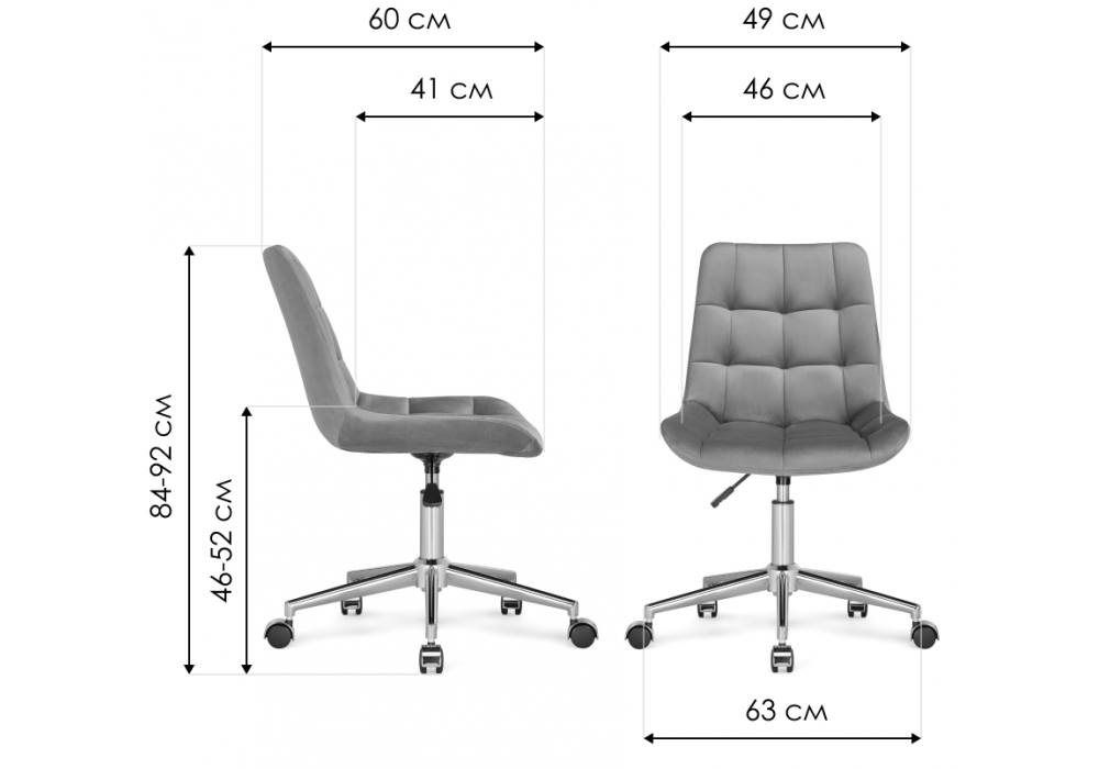 Высота спинки: 38 см. Материал каркаса - металл; Материал сиденья - велюр; Материал обивки - велюр; Цвет ножек - черный; Ширина - 49; Глубина - 60; Высота - 84; Ширина сиденья - 46; Глубина сиденья - 41; Высота сиденья - 46; Высота максимальная - 92;