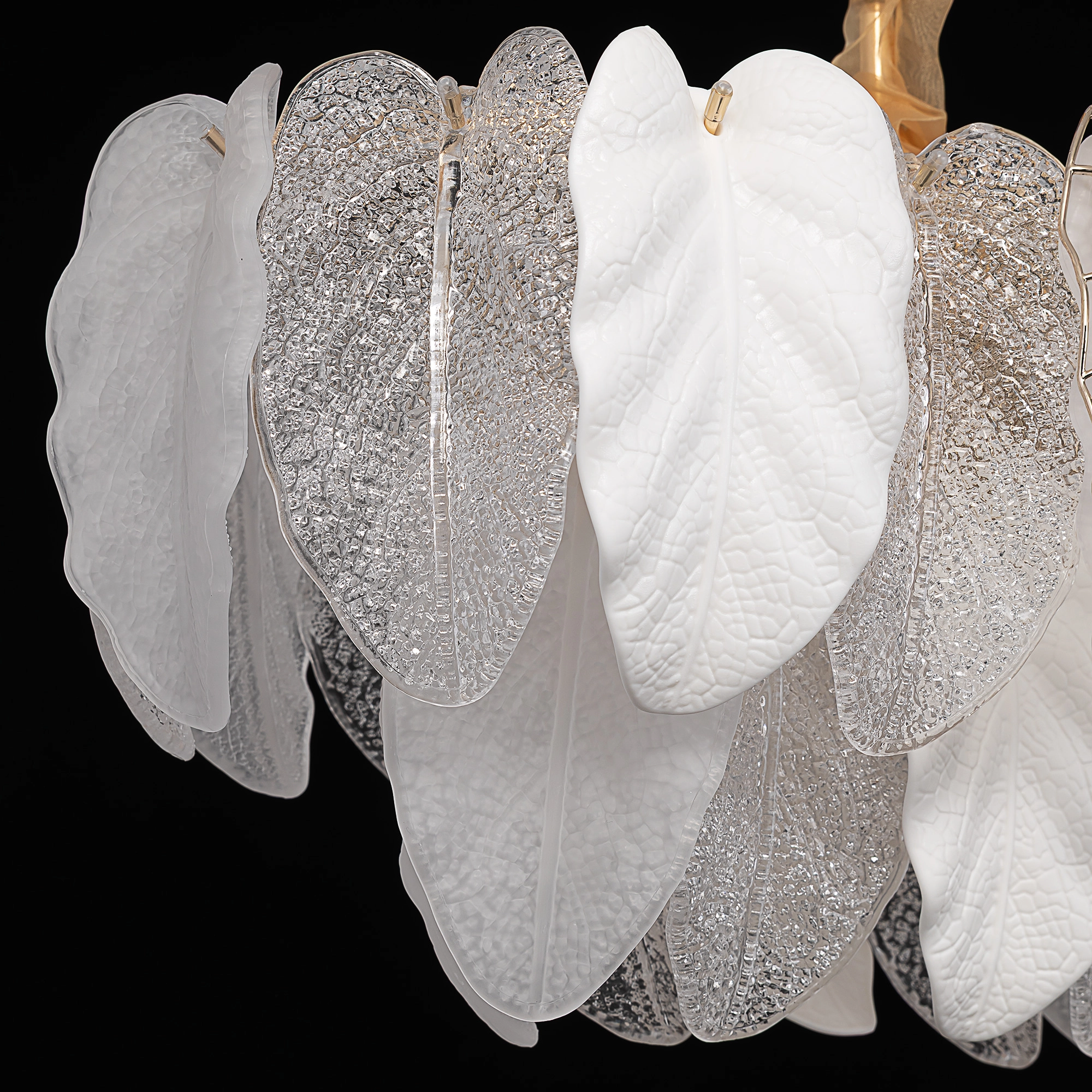 Металлический каркас золотистого оттенка переливается в лучах света. Листья из полуматового и прозрачного рифленого стекла, белой керамики, а также металлические листья с прожилками, отлитые по ювелирной технологии, подчеркивают флористическую изысканность и четкость силуэта люстры. В изделии используются 16 лампочек с цоколем Е14, высоту подвесных цепей можно отрегулировать.