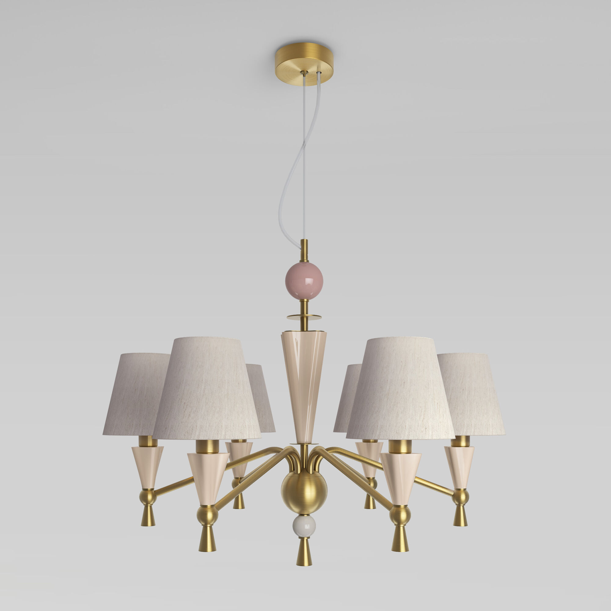 Люстра для тех, кто ценит вечные ценности: надёжная латунная арматура с благородным блеском прослужит долгие годы, не теряя лоска; тканевые абажуры создают деликатное освещение, а керамический декор подчёркивает безупречный вкус владельца.