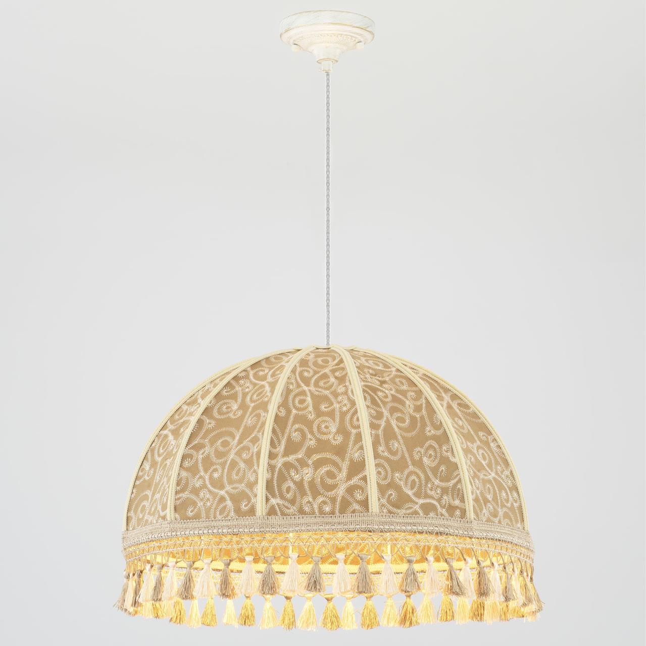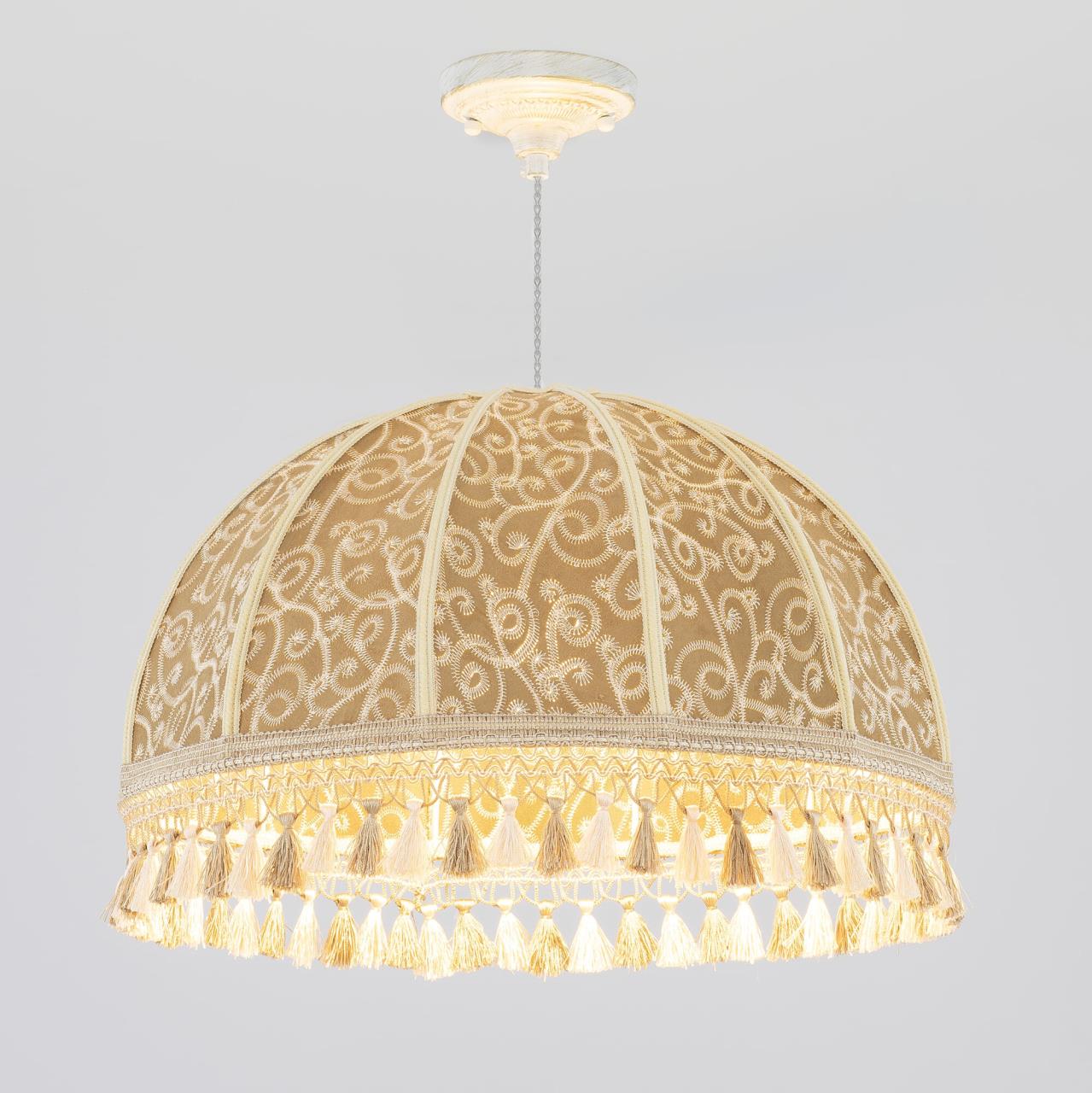 Уютный подвесной светильник Citilux Базель CL407025 выполнен в классическом стиле. Потолочное основание металлическое, молочного цвета с благородной золотистой патиной, украшено искусным орнаментом. Абажур тканевый, цвета капучино декорирован оригинальной вышивкой и обшит бахромой.