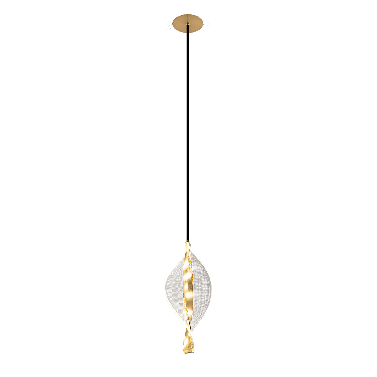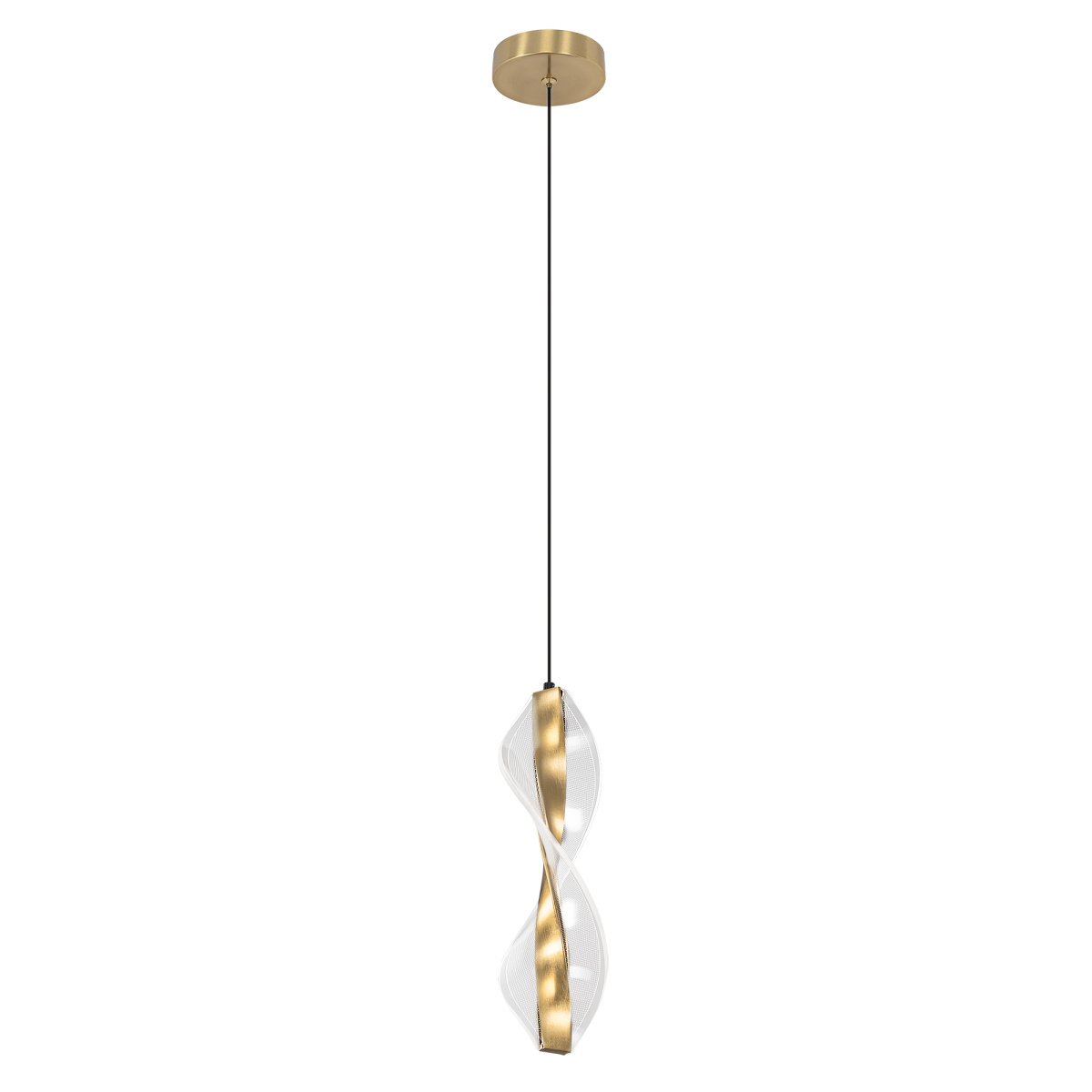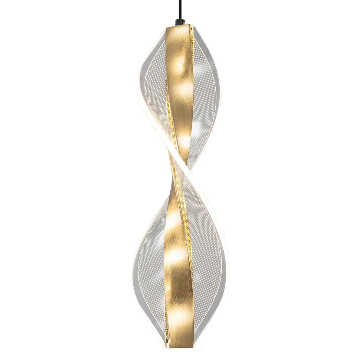 Основание металлическое, оттенка латунь, поверхность матовая. Подвесной светодиодный модуль оригинальной формы можно зафиксировать на разной высоте, создав свой индивидуальный дизайн. Корпус LED-модуля — алюминиевый с гальваническим покрытием, цвет благородная бронза. Витой рассеиватель изготовлен из прозрачного оптического акрила с изящной точечной гравировкой.