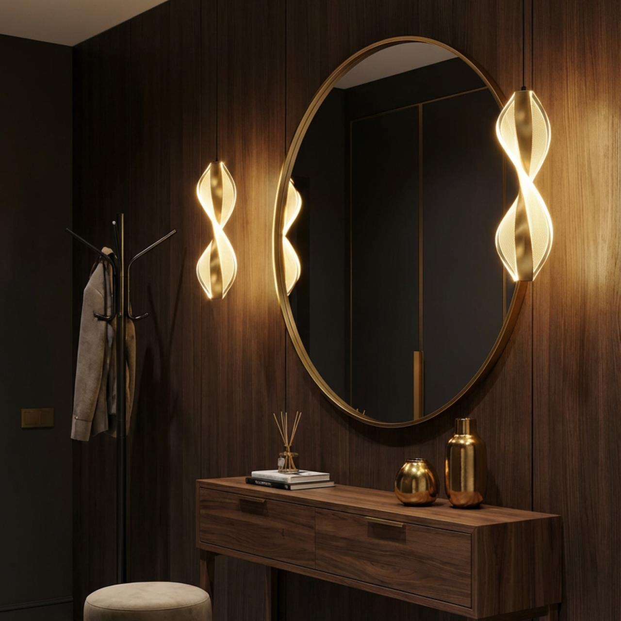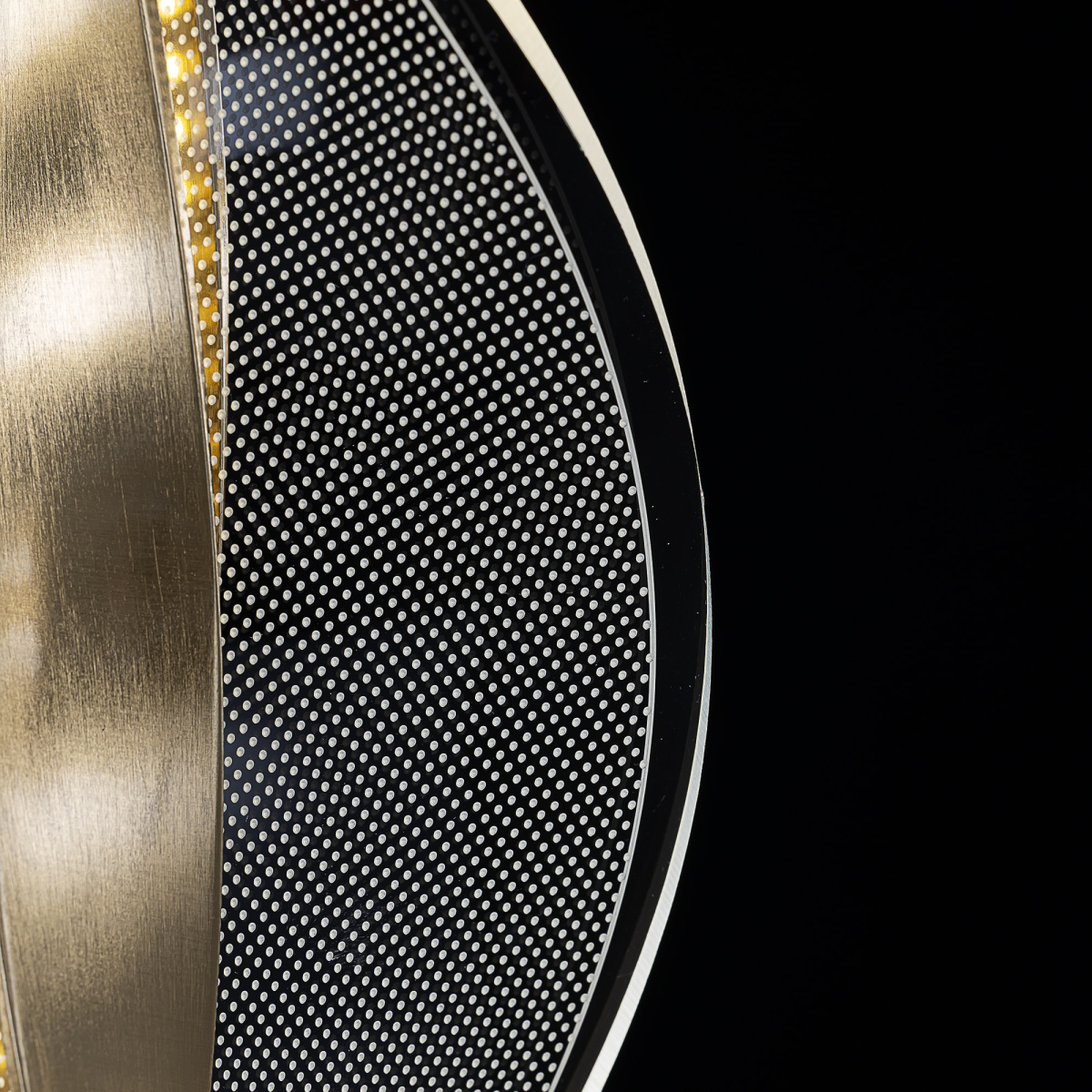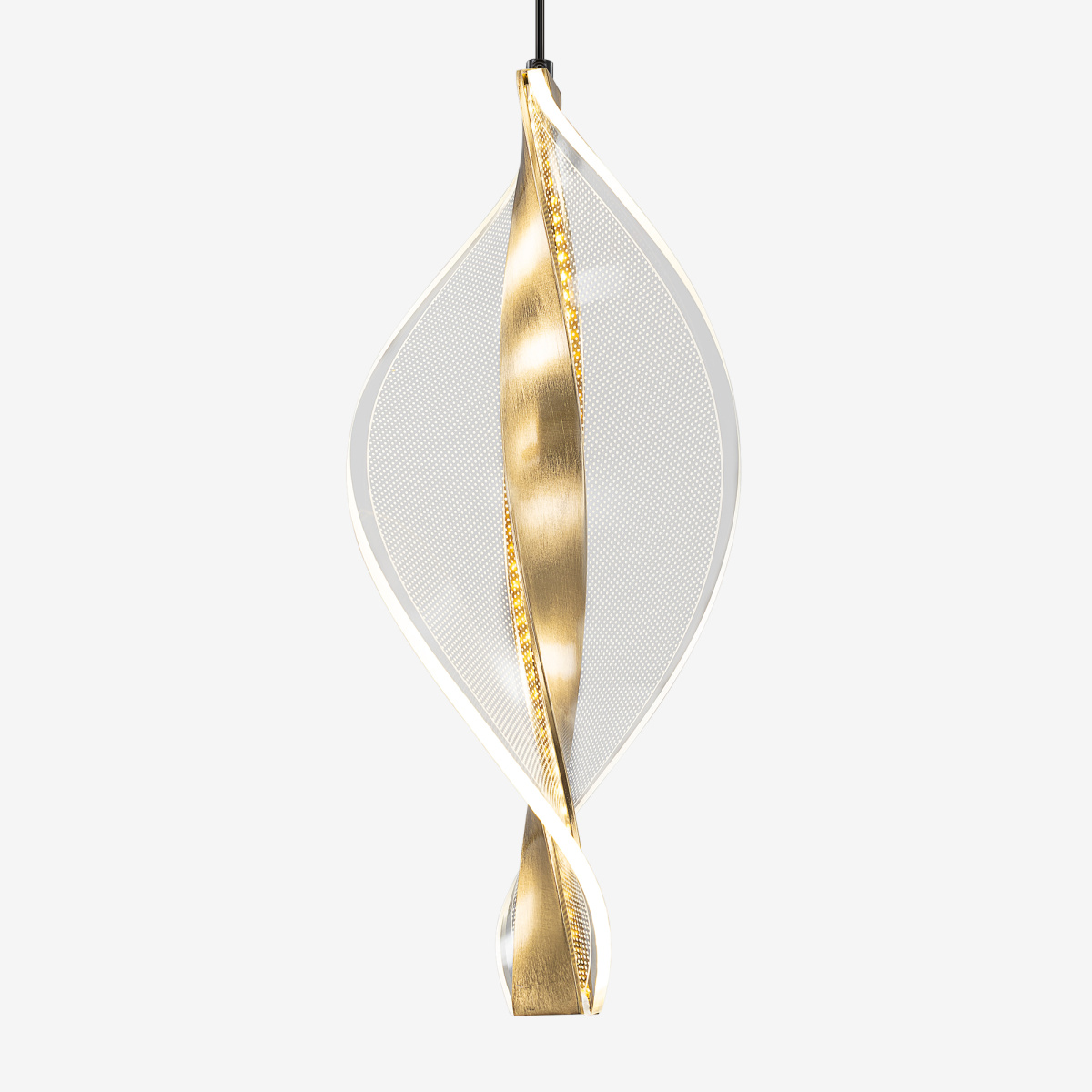 Основание металлическое, оттенка латунь, поверхность матовая. Подвесной светодиодный модуль оригинальной формы можно зафиксировать на разной высоте, создав свой индивидуальный дизайн. Корпус LED-модуля — алюминиевый с гальваническим покрытием, цвет благородная бронза. Витой рассеиватель изготовлен из прозрачного оптического акрила с изящной точечной гравировкой.