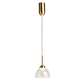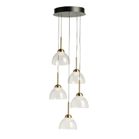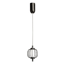 Металлическое основание светильника окрашено в черный цвет. Светодиодный источник света закрыт белым матовым акрилом. Люстра декорирована плафоном из прозрачного стекла.