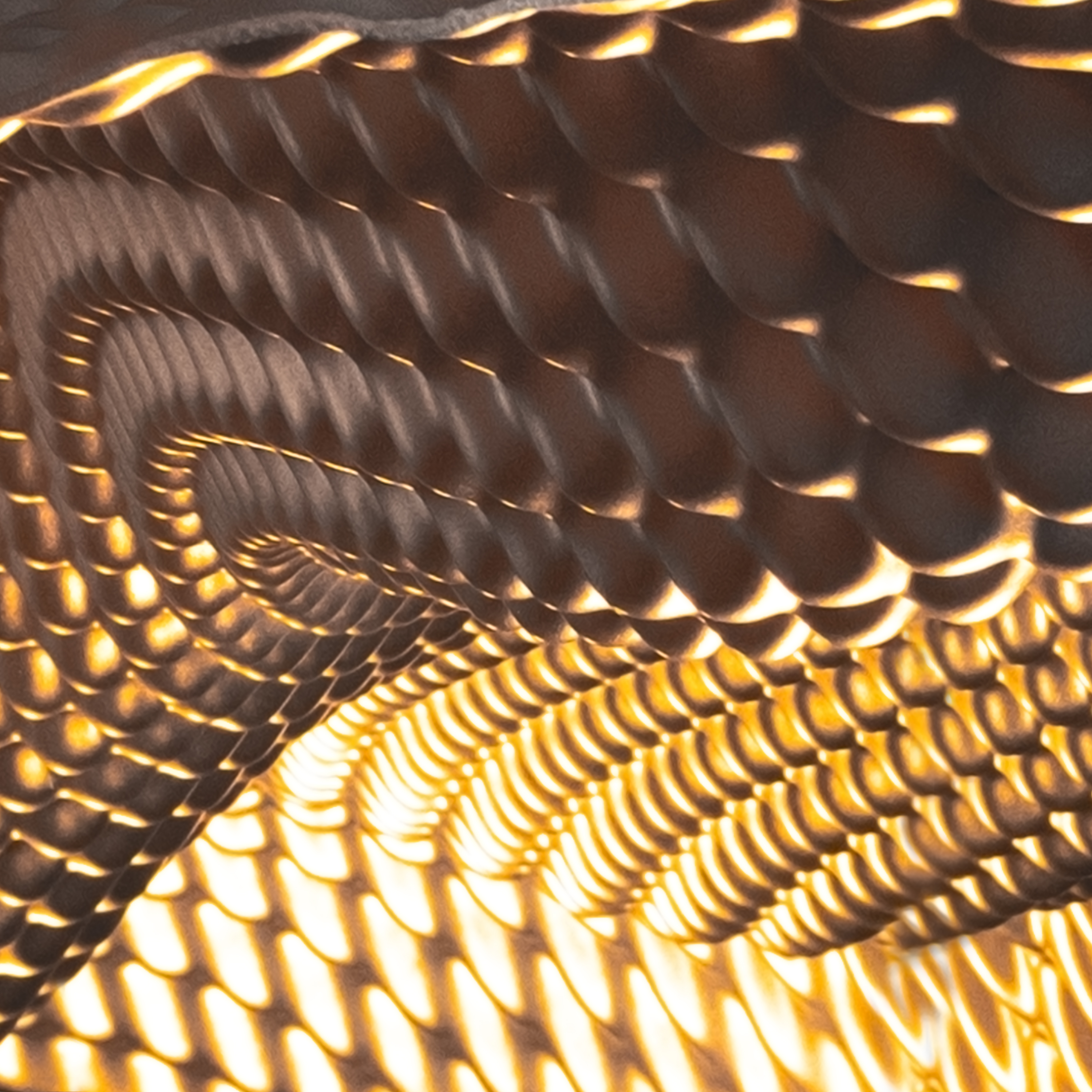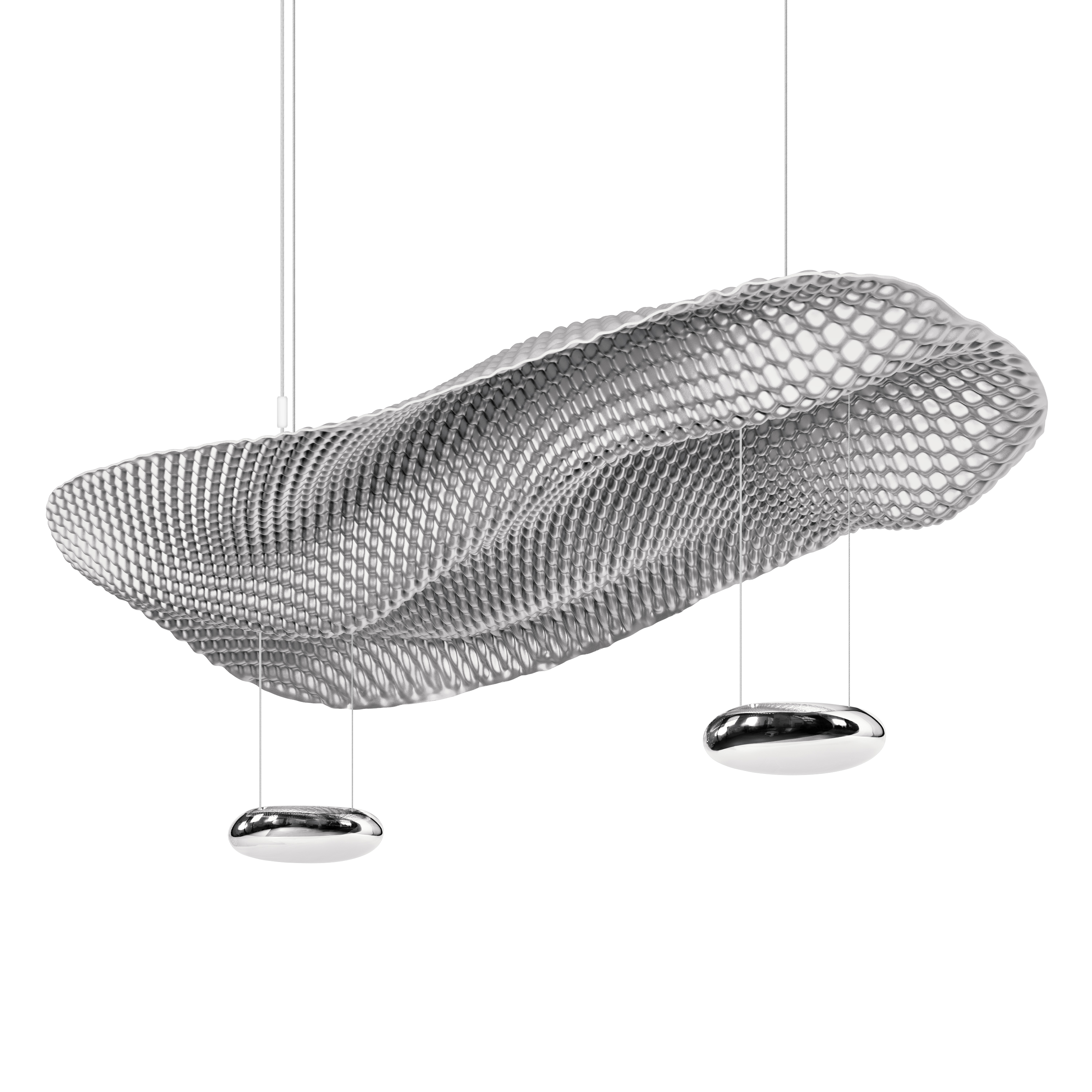 Подвесной светильник, который больше напоминает современную скульптуру, чем привычный источник света. Его плавный, текучий силуэт будто завис в воздухе — как застывшая волна или легкая ткань, пойманная движением. Металлическая сетчатая поверхность создает игру света и тени, придавая всему пространству ощущение глубины и динамики.