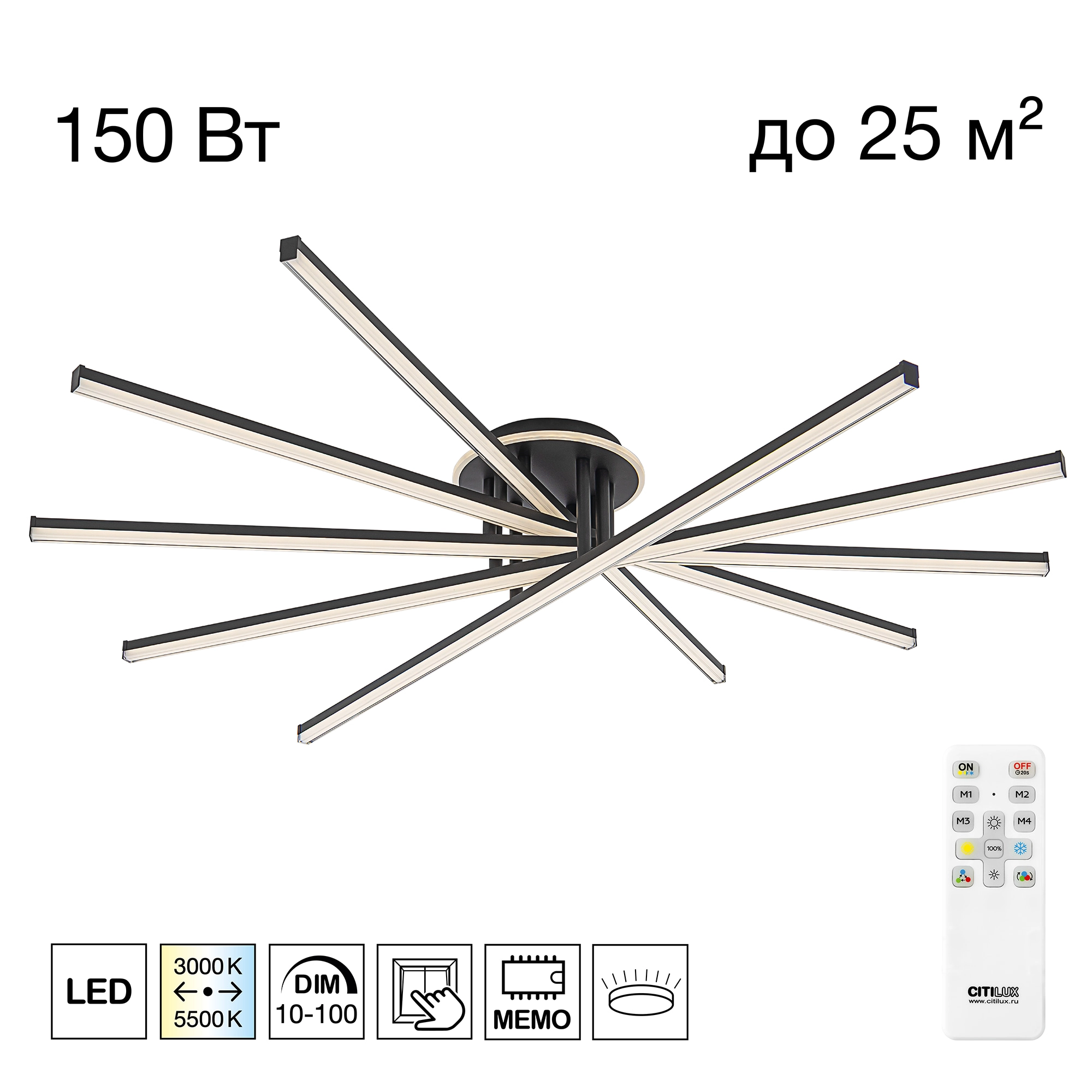 При помощи инфракрасного пульта можно плавно регулировать яркость освещения и цветовую температуру света, настраивая модель так, как вам комфортно. Есть также режим ночника, а также память последнего режима. Можно сохранить любимые режимы освещения (до 4-х штук) и переключать их при помощи простого выключателя на стене. Мощность люстры — 150 Вт, ее можно установить на любой потолок (включая натяжные).