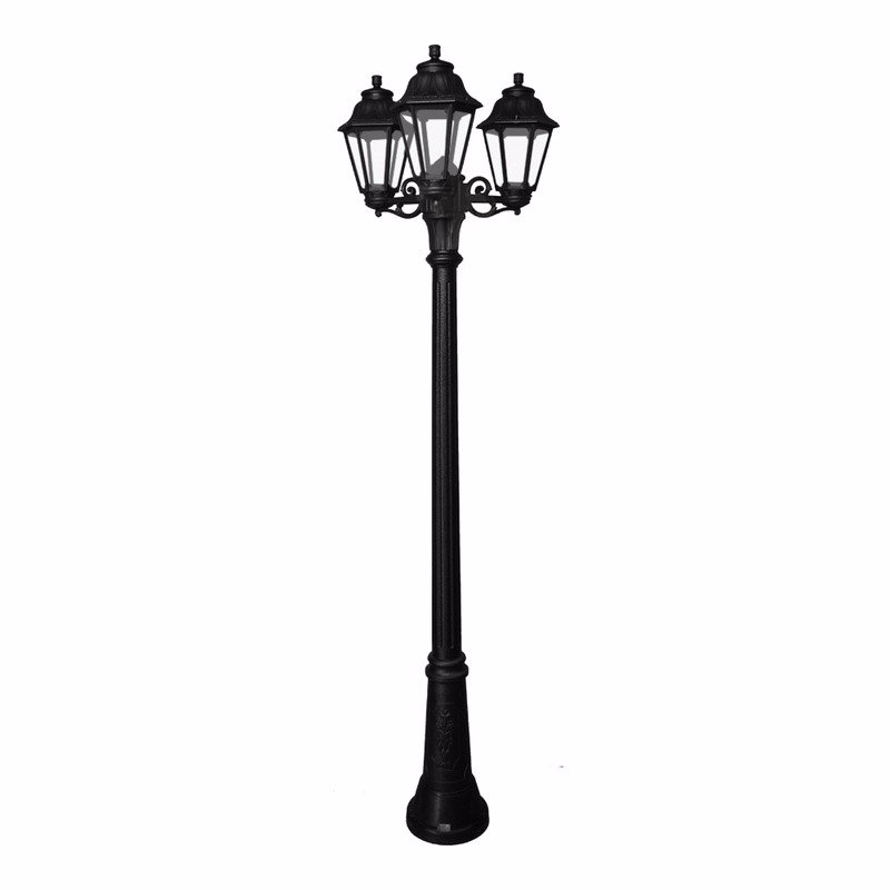 Садово-парковый фонарь FUMAGALLI серии ANNA, модель ANNA/GIGI/BISSO 3L. Парковый торшер, столб GIGI с тремя уличными фонарями ANNA на малых консолях BISSO. Используются для архитектурного и ландшафтного освещения в стиле "классика". Место установки столбиков освещения - парковые дорожки, cкверы, садовые участки, тротуары, а так же ландшафтные и архитектурные объекты. Изготовлены в Италии, по уникальным технологиям "FUMAGALLI" из современного композитного полимера RESIN. Этот материал в 5 раз прочнее металла, не ржавеет, не окисляется, не выгорает на солнце, его не нужно красить. Все светильники пыле-влаго защищены по стандарту IP55 (защита от пыли, защита от струй воды, падающих под любым углом). Рассеиватель выполнен из антивандального, не мутнеющего и не горючего PMMA (ПолиМетилМетаАкрилат). Срок службы светильника - не менее 20 лет. Температура использования от -60 до +90. В серии ANNA есть фонари в настенном (BISSO/ANNA, PORPORA/ANNA) подвесном (SICHEM/ANNA, SICHEM/ANNA 3L) и наземном исполнении (IAFAET.R/ANNA, ALOE.R/ANNA, ARTU/ANNA, GIGI/ANNA, RICU/ANNA, RICU/ISSO/ANNA 1L, RICU/ISSO/ANNA 2L, RICU/ISSO/ANNA 3L) со столбами разной высоты, с разным количеством и конфигурацией голов. Консоли настенных фонарей и кронштейны светильников на столбах освщения могут устанавливаться вверх/вниз. Столбы выше 150 см имеют в основе мощную стальную трубу с двойной оцинковкой. При заказе требуется выбрать цвет корпуса, цвет плафона и тип патрона (Е-27 или LED GX-53). Возможен светодиодный вариант. По стилю и дизайну серия уличных светильников ANNA похожа на светильники среднего размера серии RUT и на светильники большого размера серии NOEMI. По размеру ANNA относится к малым светильникам как серия SABA и GLOBE 250.