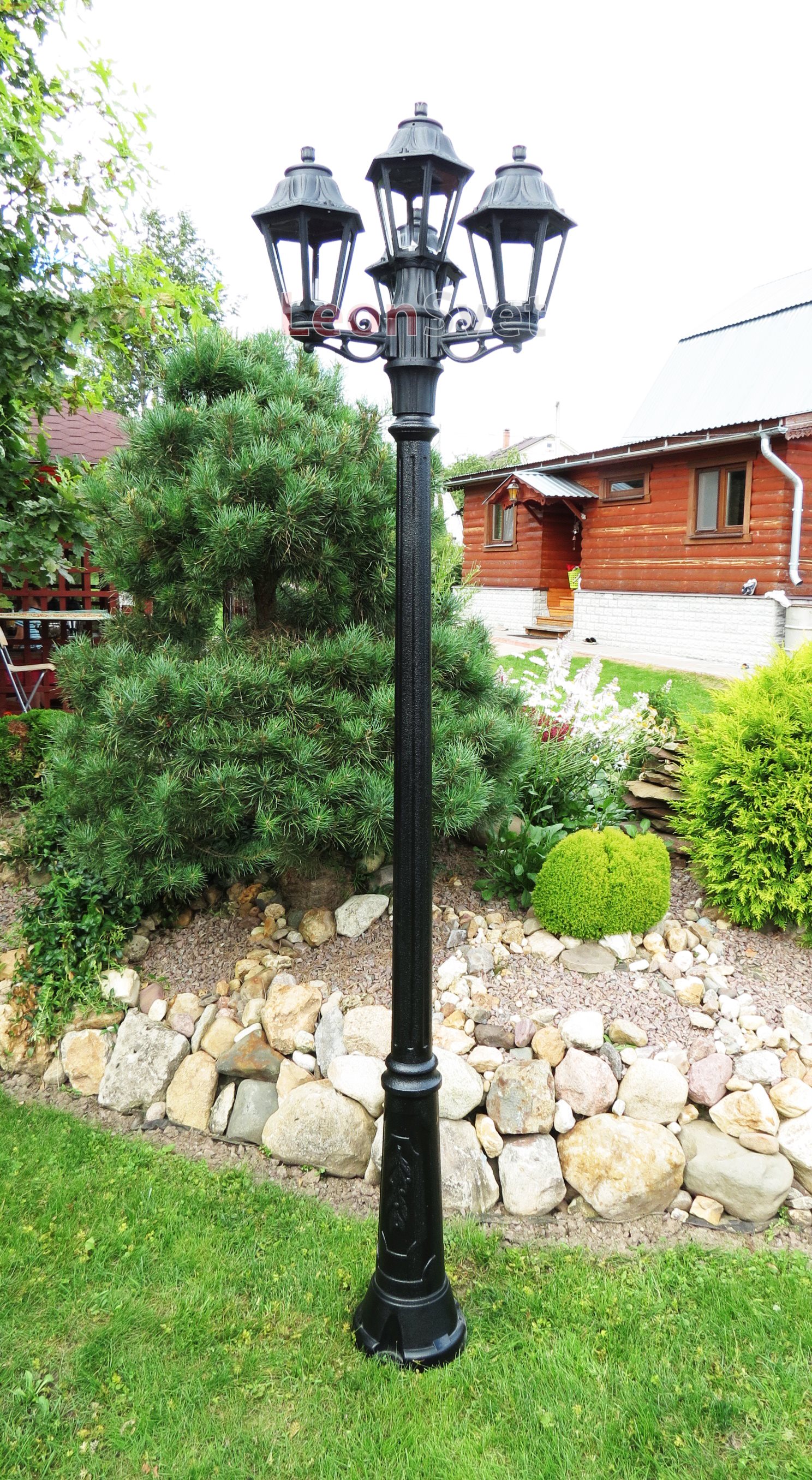 Садово-парковый фонарь FUMAGALLI серии ANNA, модель ANNA/RICU/BISSO 3L+1. Парковый торшер, столб RICU с тремя уличными фонарями ANNA на малых консолях BISSO и одним фонарем на столбе. Используются для архитектурного и ландшафтного освещения в стиле "классика". Место установки столбиков освещения - парковые дорожки, cкверы, садовые участки, тротуары, а так же ландшафтные и архитектурные объекты. Изготовлены в Италии, по уникальным технологиям "FUMAGALLI" из современного композитного полимера RESIN. Этот материал в 5 раз прочнее металла, не ржавеет, не окисляется, не выгорает на солнце, его не нужно красить. Все светильники пыле-влаго защищены по стандарту IP55 (защита от пыли, защита от струй воды, падающих под любым углом). Рассеиватель выполнен из антивандального, не мутнеющего и не горючего PMMA (ПолиМетилМетаАкрилат). Срок службы светильника - не менее 20 лет. Температура использования от -60 до +90. В серии ANNA есть фонари в настенном (BISSO/ANNA, PORPORA/ANNA) подвесном (SICHEM/ANNA, SICHEM/ANNA 3L) и наземном исполнении (IAFAET.R/ANNA, ALOE.R/ANNA, ARTU/ANNA, GIGI/ANNA, RICU/ANNA, RICU/ISSO/ANNA 1L, RICU/ISSO/ANNA 2L, RICU/ISSO/ANNA 3L) со столбами разной высоты, с разным количеством и конфигурацией голов. Консоли настенных фонарей и кронштейны светильников на столбах освщения могут устанавливаться вверх/вниз. Столбы выше 150 см имеют в основе мощную стальную трубу с двойной оцинковкой. При заказе требуется выбрать цвет корпуса, цвет плафона и тип патрона (Е-27 или LED GX-53). Возможен светодиодный вариант. По стилю и дизайну серия уличных светильников ANNA похожа на светильники среднего размера серии RUT и на светильники большого размера серии NOEMI. По размеру ANNA относится к малым светильникам как серия SABA и GLOBE 250.