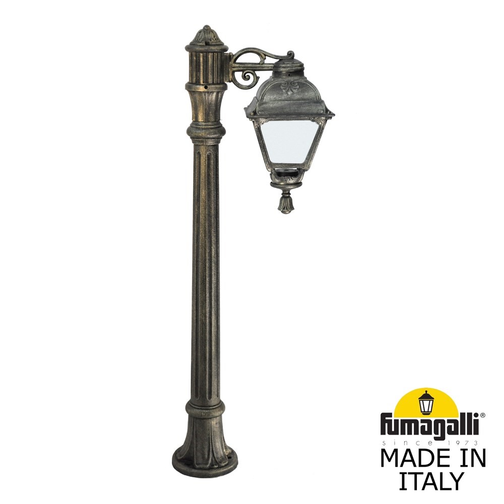 Садовый светильник-столбик FUMAGALLI серии CEFA, модель CEFA/ALOE.R./BISSO 1L Столбик освещения ALOE.R и один светильник CEFA расположеный "вниз", на малом кронштейне BISSO . Используются для архитектурного и ландшафтного освещения в стиле "классика". Место установки столбиков освещения - парковые дорожки, тротуары, газоны в парках и скверах, а так же ландшафтные и архитектурные объекты. Изготовлены в Италии, по уникальным технологиям "FUMAGALLI" из современного композитного полимера RESIN. Этот материал в 5 раз прочнее металла, не ржавеет, не окисляется, не выгорает на солнце, его не нужно красить. Все светильники пыле-влаго защищены по стандарту IP55 (Пылезащищенные, защита от водяных струй с любого направления). В комплекте идут крепежи и закладные элементы. Рассеиватель выполнен из антивандального, не мутнеющего и не горючего PMMA (ПолиМетилМетаАкрилат). Срок службы светильника - не менее 20 лет. Температура использования от -60 до +90. В серии CEFA есть фонари в настенном (BISSO/CEFA, OFIR/CEFA, MIRRA/CEFA, PORPORA/CEFA) подвесном (SICHEM/CEFA) и наземном исполнении (MINILOT/CEFA, MIZAR.R/CEFA, IAFAET.R/CEFA, ALOE.R/CEFA, ARTU/CEFA, GIGI/CEFA, RICU/CEFA, RICU/ISSO/CEFA 2L, NEBO/CEFA, NEBO OFIR/CEFA 2L, NEBO OFIR/CEFA 3L) со столбами разной высоты, с разным количеством и конфигурацией голов. Консоли настенных фонарей и кронштейны светильников на столбах освщения могут устанавливаться вверх/вниз. Столбы выше 150 см имеют в основе мощную стальную трубу с двойной оцинковкой. При заказе требуется выбрать цвет корпуса, цвет плафона и тип патрона. По стилю и дизайну серия уличных светильников CEFA похожа на светильники большого размера SIMON и на светильники очень большого размера (Гранд) PIETRO. По размеру CEFA относится к средним светильникам как серия RUT, SALEM и GLOBE 300.