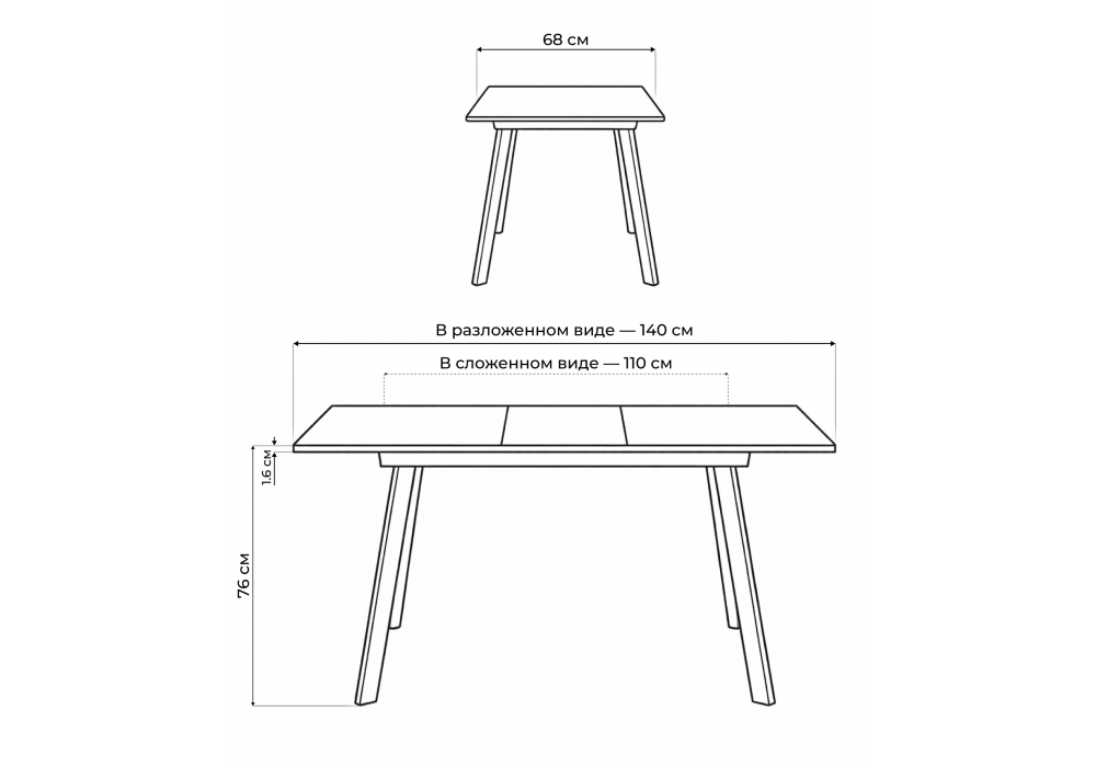 Материал каркаса - металл; Материал столешницы - Стекло; Цвет ножек - черный; Ширина - 68; Высота - 76; Длина стола в разложенном виде - 140; Длина - 110;