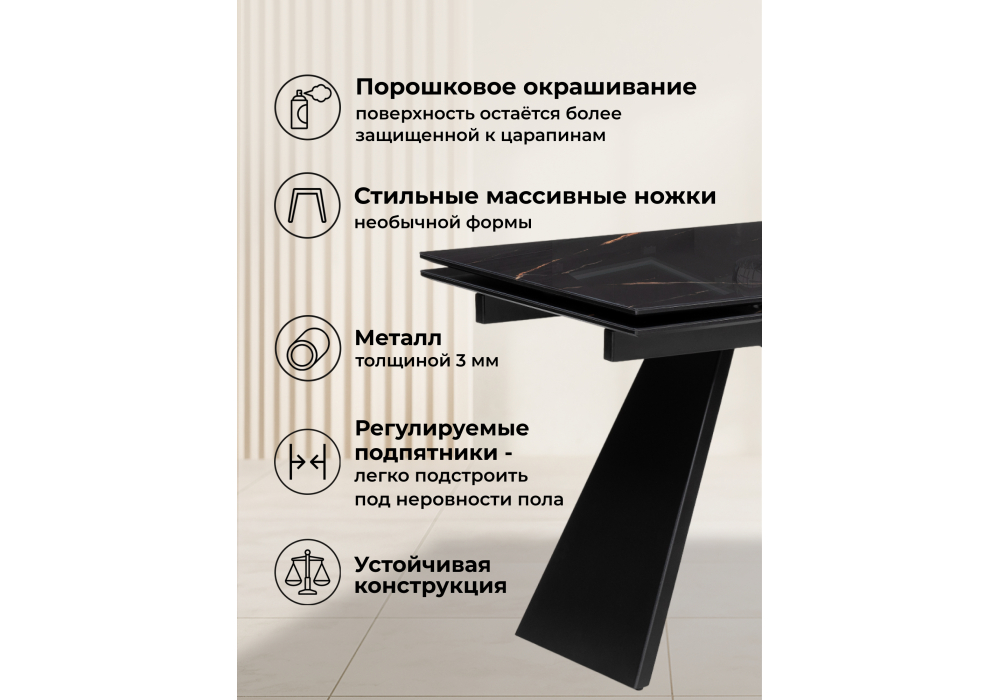 Толщина столешницы: 2 см. Материал каркаса - металл; Материал столешницы - Стекло; Цвет ножек - черный; Ширина - 80; Высота - 79; Длина стола в разложенном виде - 200; Длина - 140;
