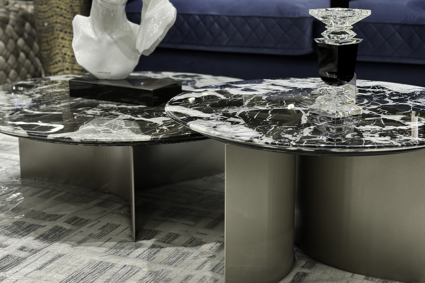 Роскошный журнальный стол с круглой столешницей из натурального мрамора с полимерным покрытием станет доминантой просторной гостиной или холла в стиле ар-деко. Столешница выполнена из натурального камня черного цвета с белыми прожилками. Уникальный природный рисунок мрамора, неповторимый в каждом изделии, делает этот журнальный стол похожим на произведение искусства. Опоры стола, выполненные из нержавеющей стали цвета бежевый металлик, выглядят легко и изящно. Эта модель стола исполнена из искусственного черно-белого мрамора (камень с полимерным покрытием). Основание из гнутых листов нерж.стали цвета бежевый металлик.