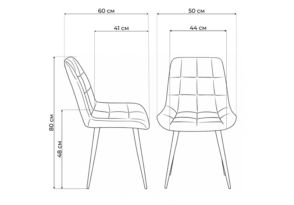 Материал каркаса - металл; Материал сиденья - велюр; Материал обивки - велюр; Ширина - 50; Глубина - 60; Высота - 80; Ширина сиденья - 44; Глубина сиденья - 41; Высота сиденья - 48;