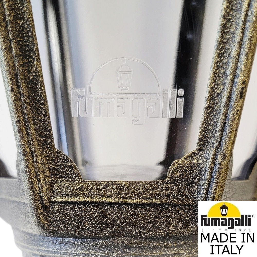 Светильники уличные настенные FUMAGALLI серии ANNA, модель ANNA/BISSO DN. Консольный уличный светильник для монтажа на стену. Настенный кронштейн BISSO малого размера и светильник ANNA установленный "вниз". Используются для фасадного и архитектурного освещения в стиле "классика". Место установки уличных светильников - фасады, колонны и другие вертикальные поверхности исторических зданий, котеджей, загородных домов, церквей, а так же, другие места где требуется и возможна установка фонарей. Изготовлены в Италии, по уникальным технологиям "FUMAGALLI" из современного композитного полимера RESIN. Этот материал в 5 раз прочнее металла, не ржавеет, не окисляется, не выгорает на солнце, его не нужно красить. Все светильники пыле-влаго защищены по стандарту IP55 (защита от пыли, защита от струй воды, падающих под любым углом). Рассеиватель выполнен из антивандального, не мутнеющего и не горючего PMMA (ПолиМетилМетаАкрилат). Срок службы светильника - не менее 20 лет. Температура использования от -60 до +90. В серии ANNA есть фонари в настенном (BISSO/ANNA, PORPORA/ANNA) подвесном (SICHEM/ANNA, SICHEM/ANNA 3L) и наземном исполнении (IAFAET.R/ANNA, ALOE.R/ANNA, ARTU/ANNA, GIGI/ANNA, RICU/ANNA, RICU/ISSO/ANNA 1L, RICU/ISSO/ANNA 2L, RICU/ISSO/ANNA 3L) со столбами разной высоты, с разным количеством и конфигурацией голов. Консоли настенных фонарей и кронштейны светильников на столбах освщения могут устанавливаться вверх/вниз. Столбы выше 150 см имеют в основе мощную стальную трубу с двойной оцинковкой. При заказе требуется выбрать цвет корпуса, цвет плафона и тип патрона. Возможен светодиодный вариант с LED цоколем GX-53. По стилю и дизайну серия уличных светильников ANNA похожа на светильники среднего размера серии RUT и на светильники большого размера серии NOEMI. По размеру ANNA относится к малым светильникам как серия SABA и GLOBE 250.