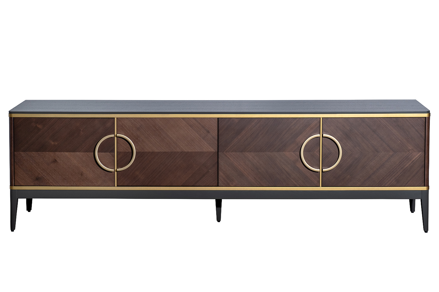 Тумба под телевизор в отделке тёмным шпоном — выразительное решение для интерьера с продуманной геометрией и благородным характером. Глубокий древесный рисунок фасадов подчеркнут тонким кантом и эффектными кольцевыми ручками, создающими ощущение современной классики. Чёткие линии корпуса уравновешены лёгкими опорами, благодаря чему модель выглядит визуально стройно и дорого. Вместительная тумба под телевизор с распашными дверцами помогает аккуратно организовать хранение техники и аксессуаров. Тумба под TV 4-х дверная из коллекции "ШПОН". Коллекция "ШПОН" является авторской разработкой студии Garda Studio, в стиле ар-деко.Габариты тумбы:ширина-200см, глубина-58см, высота-40см. Фасады коллекции "ШПОН" облицованы шпоном под цвет "Американский орех", украшены объемными полукруглыми ручками цвета "матовое золото"(ручки-металл) и декоративными элементами из массива бука под цвет "матовое золото". В состав коллекции так же входит: тумба прикроватная-арт.151SV-10001; консоль-арт.151SV-10002